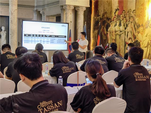 意大利TASSANI塔萨尼各位营销团队负责人纷纷展示专业性,分别围绕意大利原装进口产品解析、墙面材料对比及趋势、短频快小联盟营销、线上营销爆破、门店价格体系制定、店面销售全流程、艺术涂料标准化销售等等板块内容进行阐述。